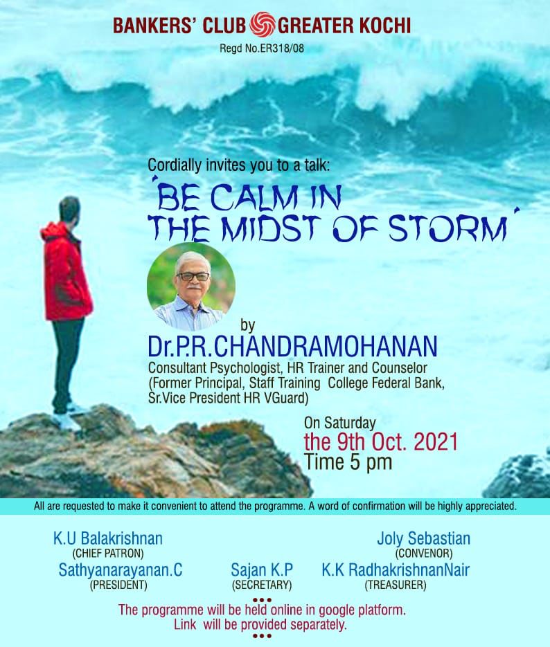 A talk on “Be Calm in the midst of storm” by Dr. P. R. Chandramohanan, Consultant Phycologist, HR Trainer and Counselor (Former Principal, Staff Training College Federal Bank, Sr. Vice President HR VGuard) on Virtual Platform (Google Meet)