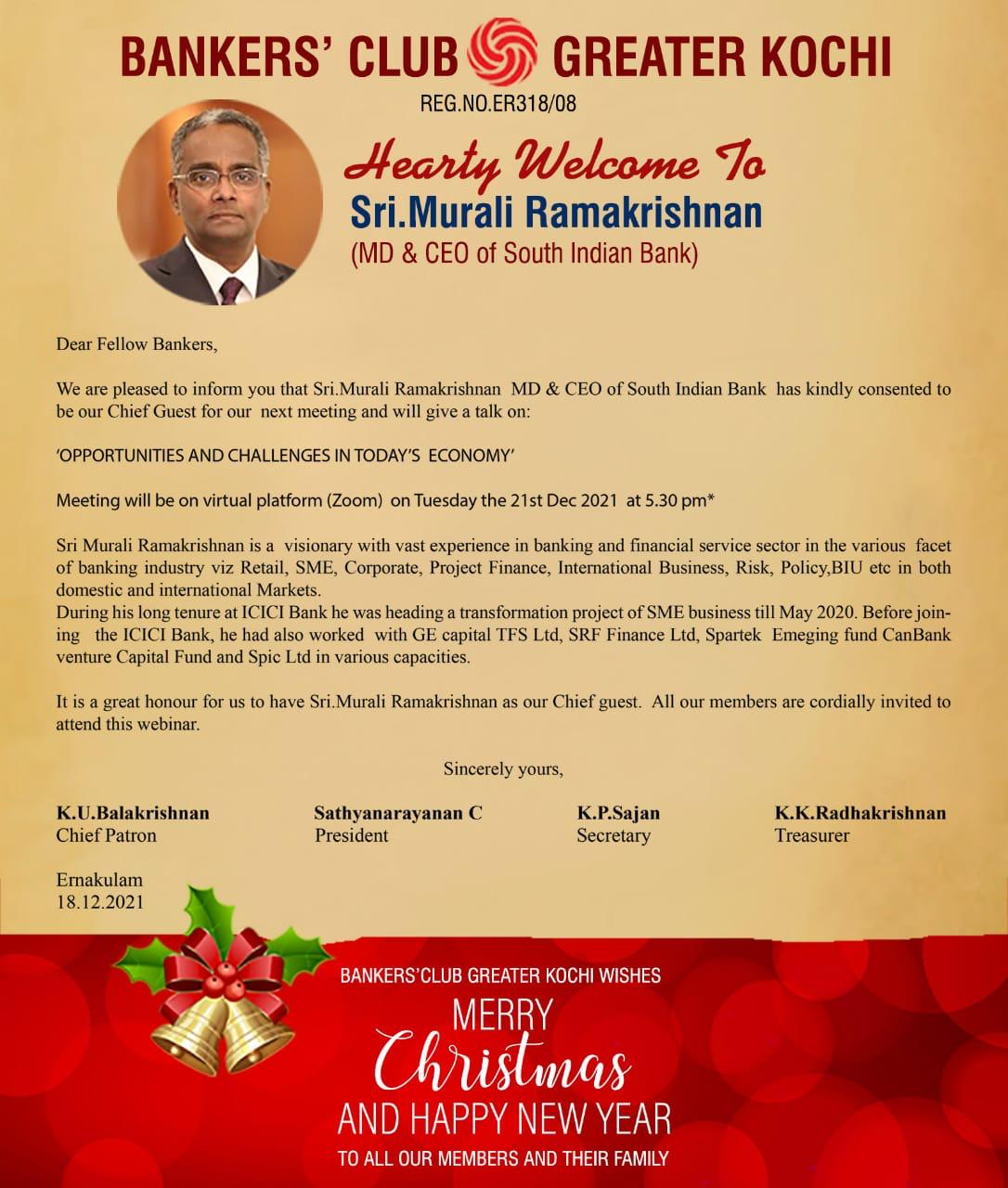 A talk on “Opportunities & Challenges In Today’s Economy” by Sri Murali Ramakrishnan (MD & CEO of South Indian Bank) on Virtual Platform (Zoom).