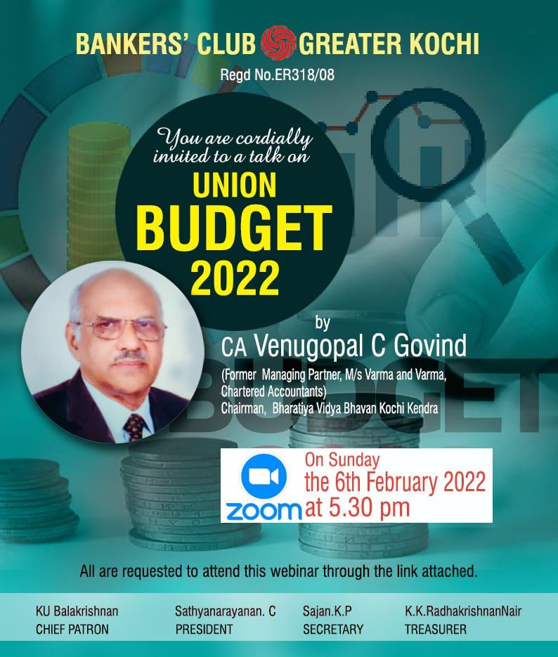 A talk by “Union Budget 2022” by CA Venugopal C Govind (Former Managing Partner, M/s Varma and Varma, Chartered Accountants) Chairman, Bharatiya Vidya Bhavan Kochi Kendra on Virtual Platform (Zoom).