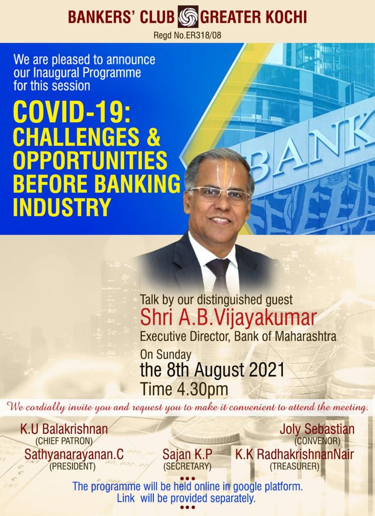 A talk by Sri.  A. B. Vijayakumar, Executive Director, Bank Of Maharashtra on the topic Covid 19: Challenges & Opportunities Before Banking Industry.